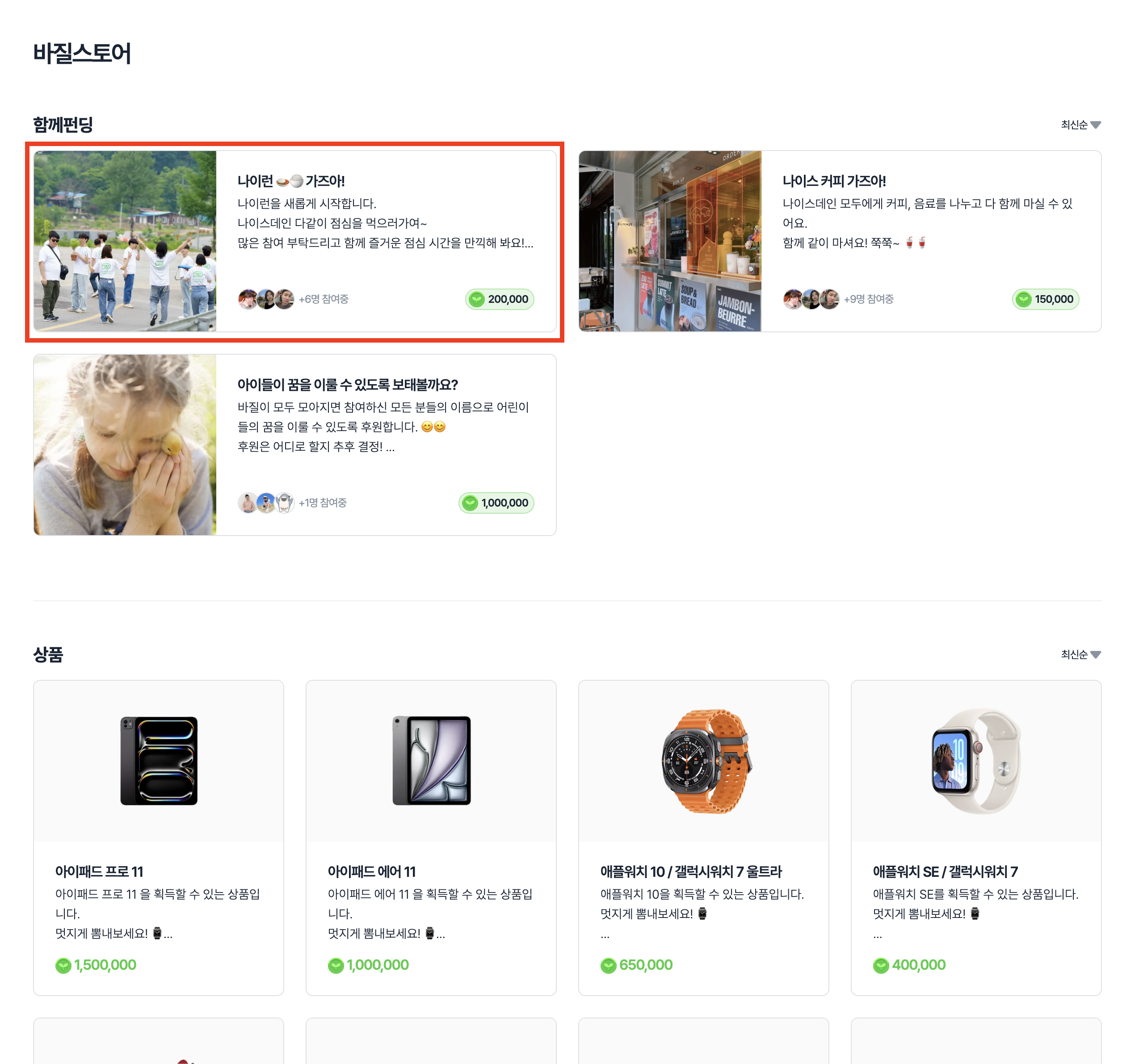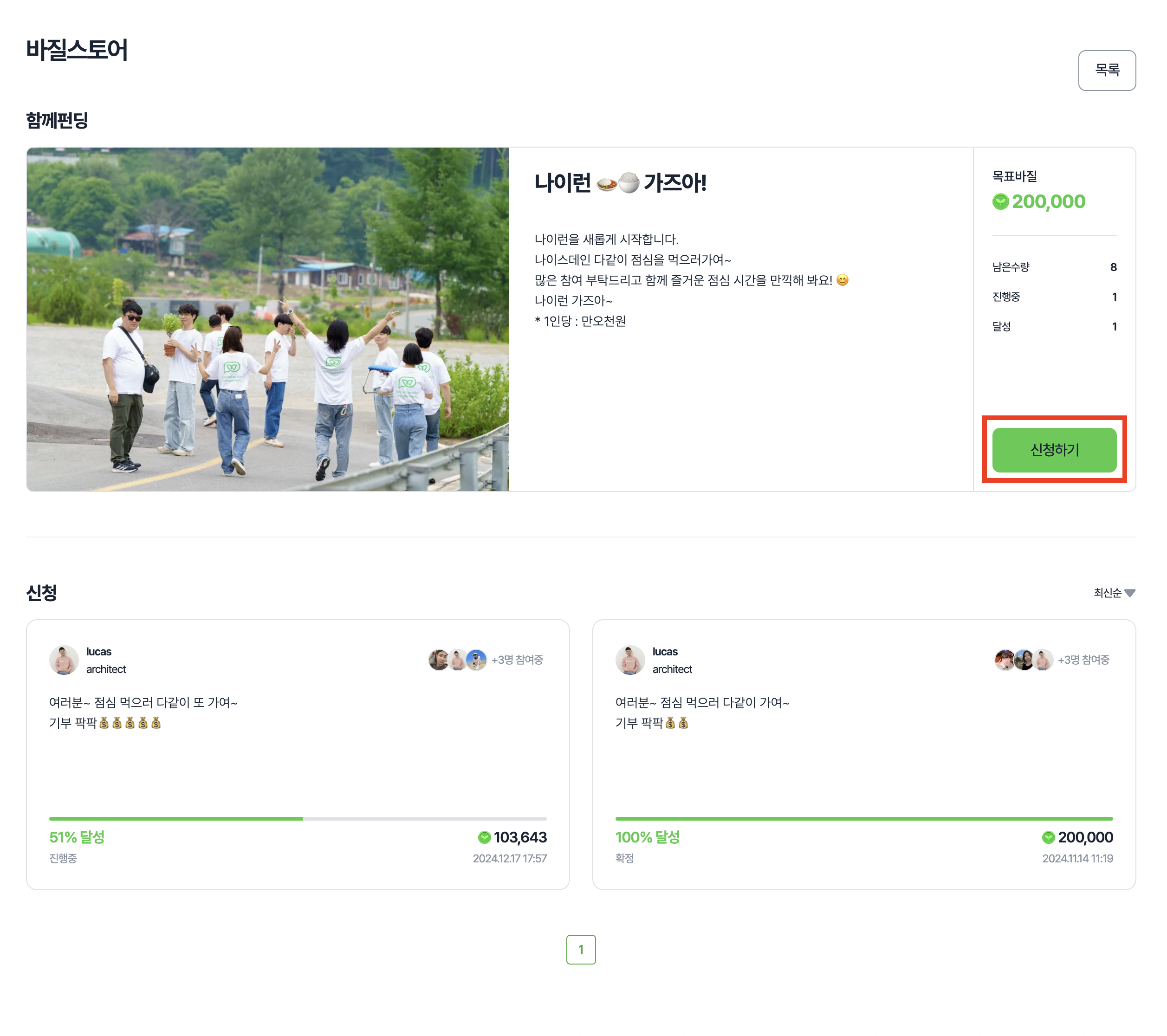 단계 1) 활동 > 바질스토어 > 함께펀딩 중 신청하려는 상품을 클릭합니다.