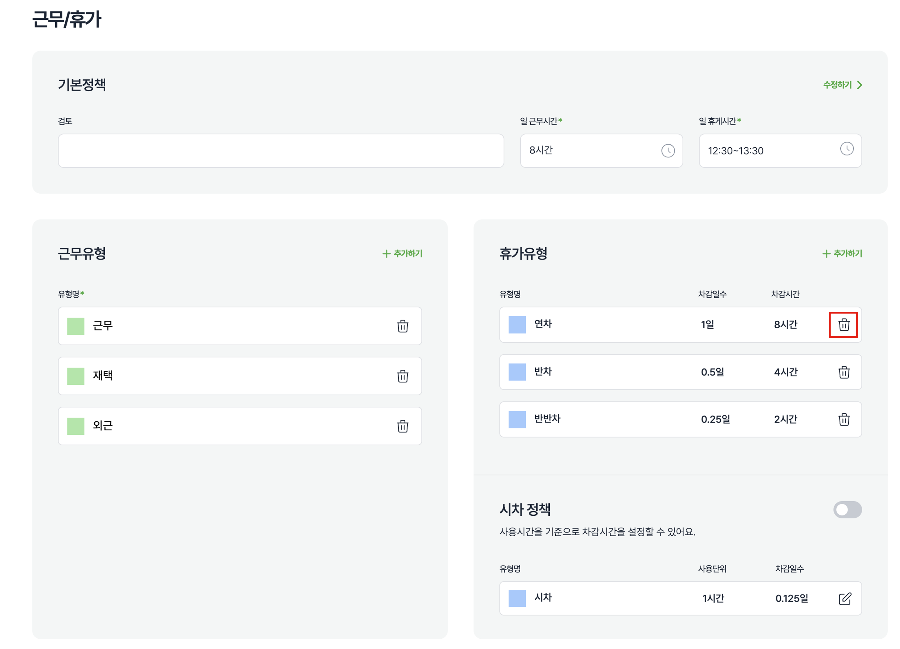 단계 1) 설정 > 문서 > 근무/휴가 메뉴에서 휴가유형의 [삭제아이콘]을 클릭해주세요.