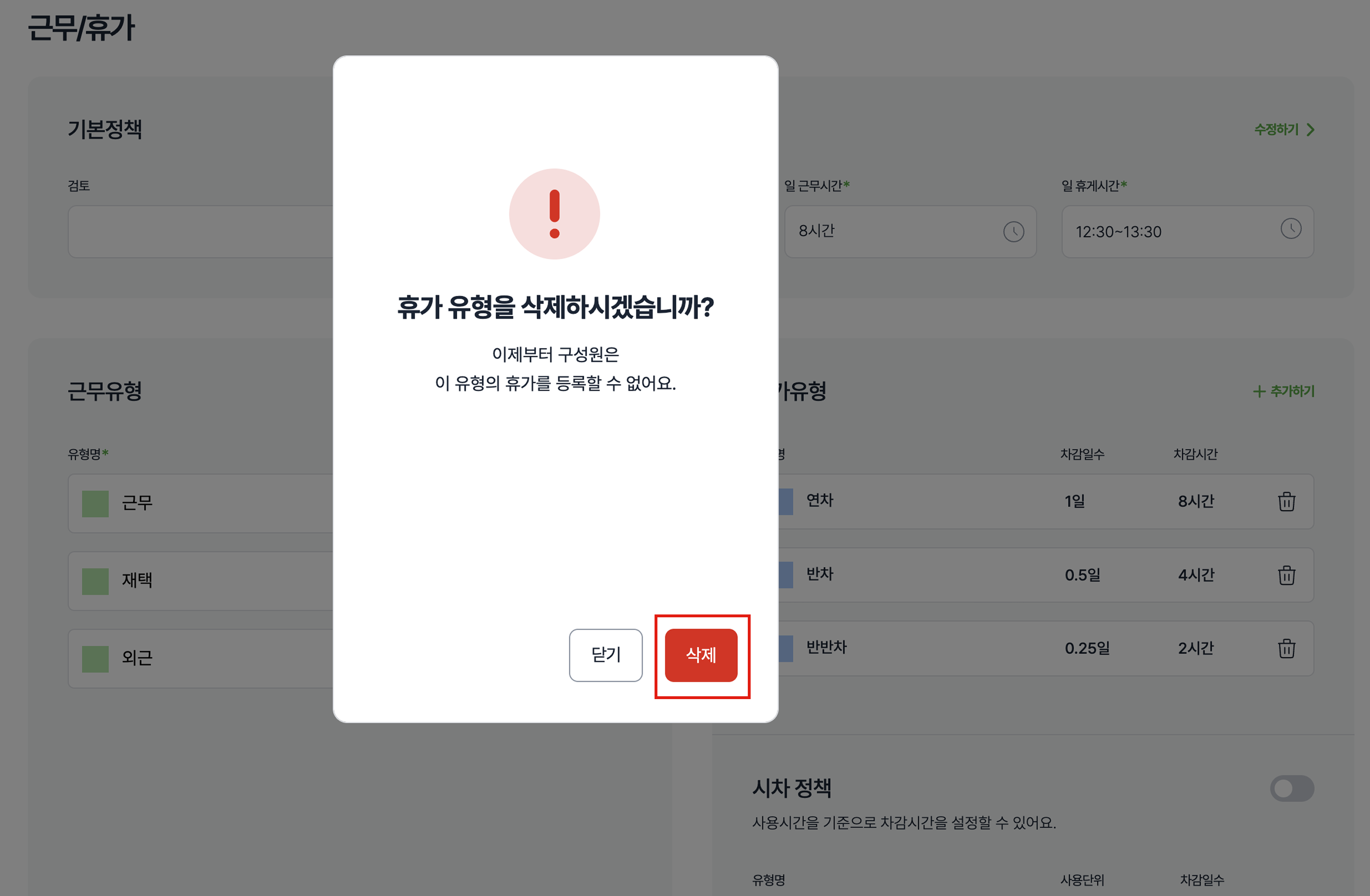 근무/휴가 등록 시 사용하는 휴가 유형을 삭제할 수 있습니다.