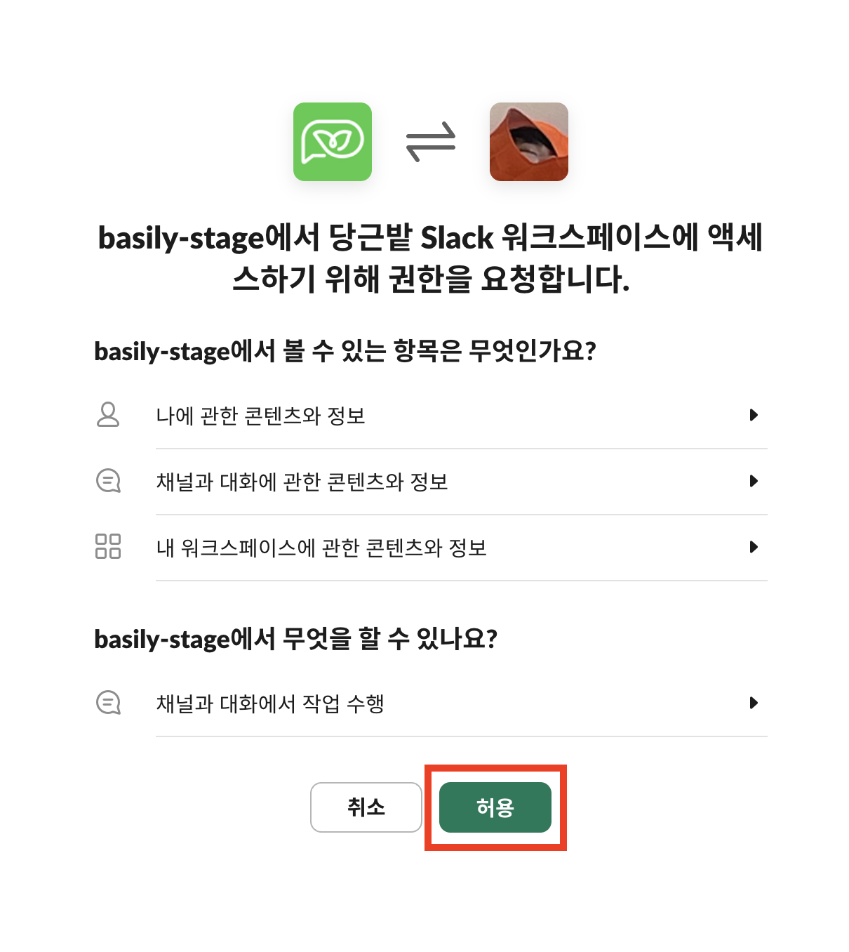 단계 2) 연동을 원하시면 [허용] 버튼을 클릭해주세요.
